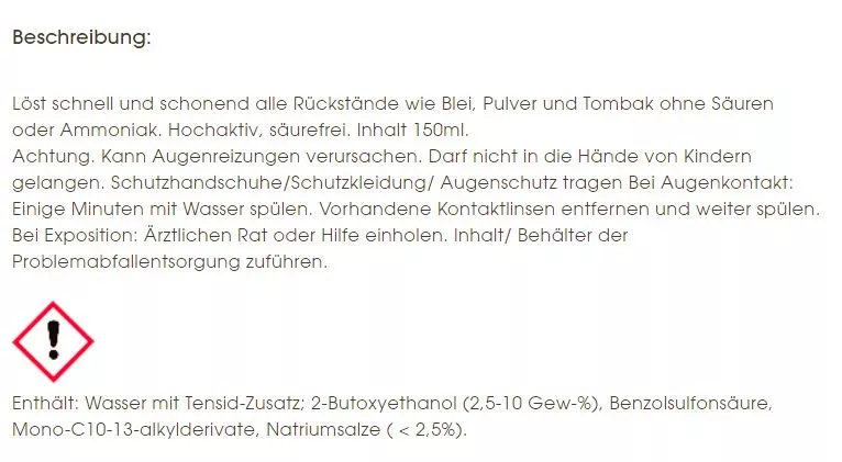 - Löst schnell und schonend alle Rückstände wie Blei, Tombak, Zink, Kupfer, Pulverreste und Oel, ohne dass Gummi, Lacke, Kunststoffe oder Holz angegriffen werden.
